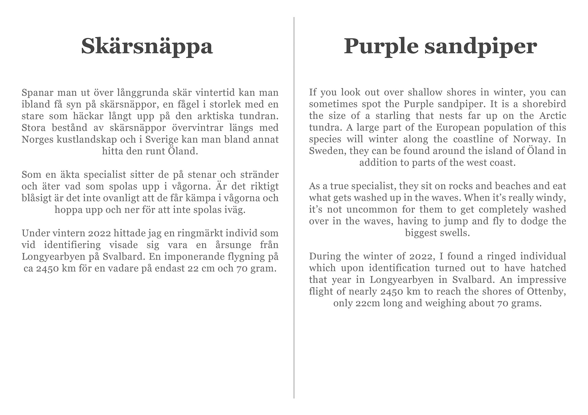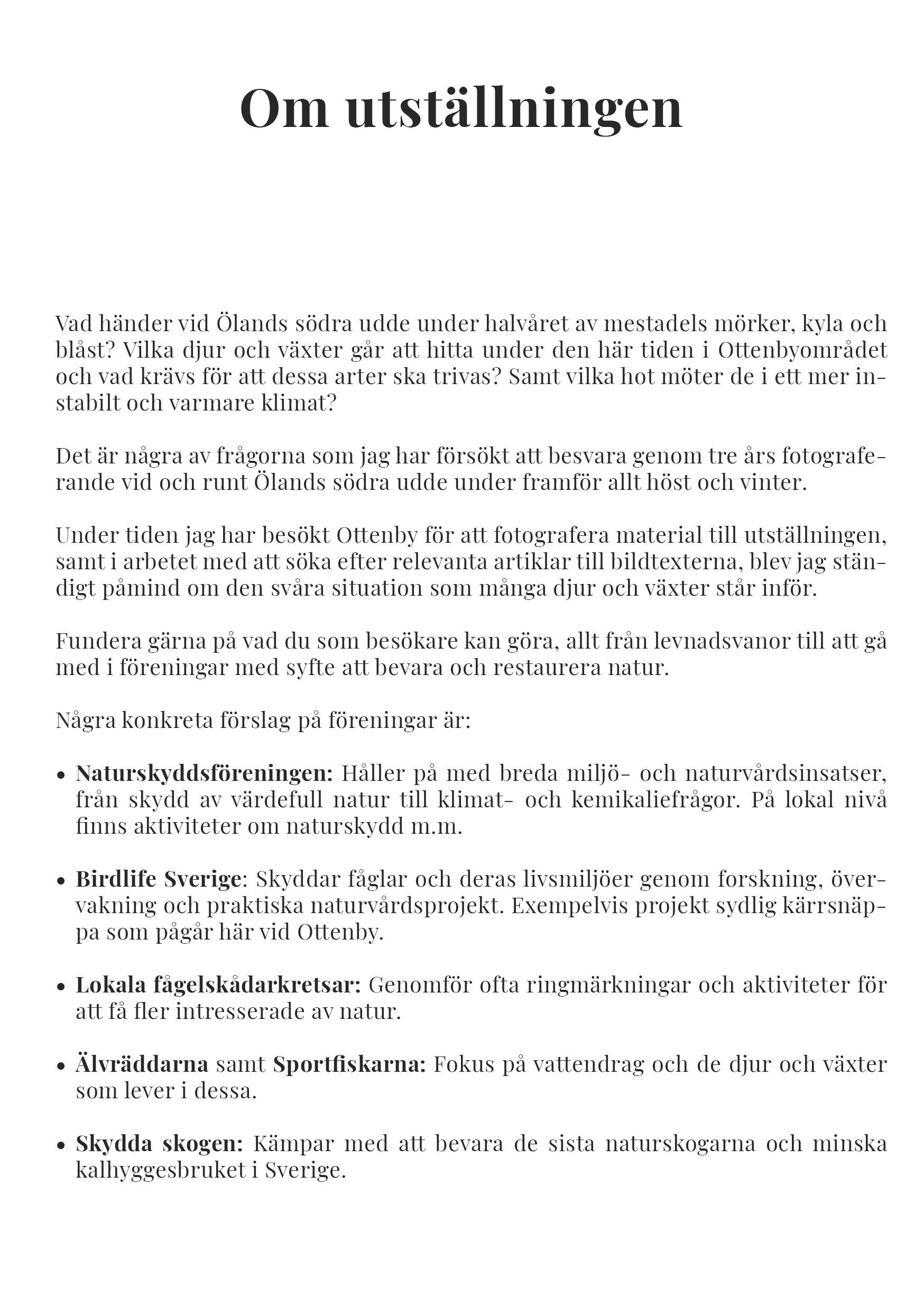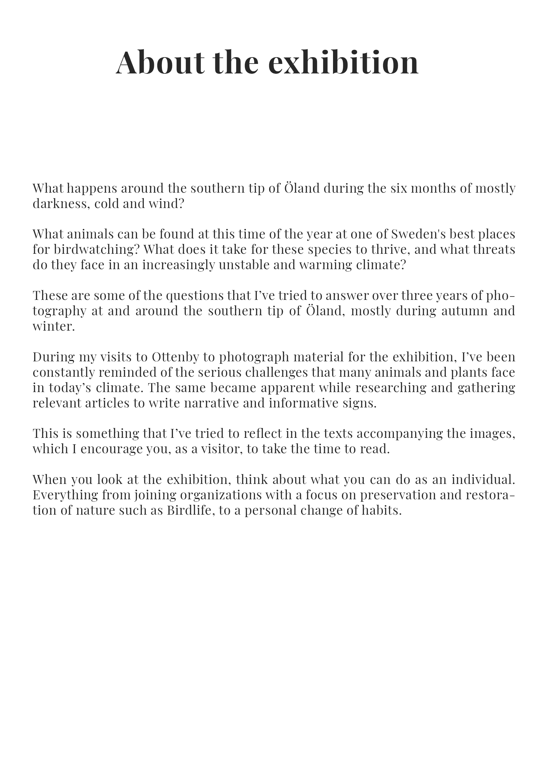 2025 höll jag en utställning på Naturum Ottenby under juni, juli och en del av augusti.Temat var vad som händer runt udden vid den tiden på året, när det mestadels är mycket ambitiösa fågelskådare som är på plats och de stora mängder turister som annars besöker ön under sommarperioden har lämnat ön.