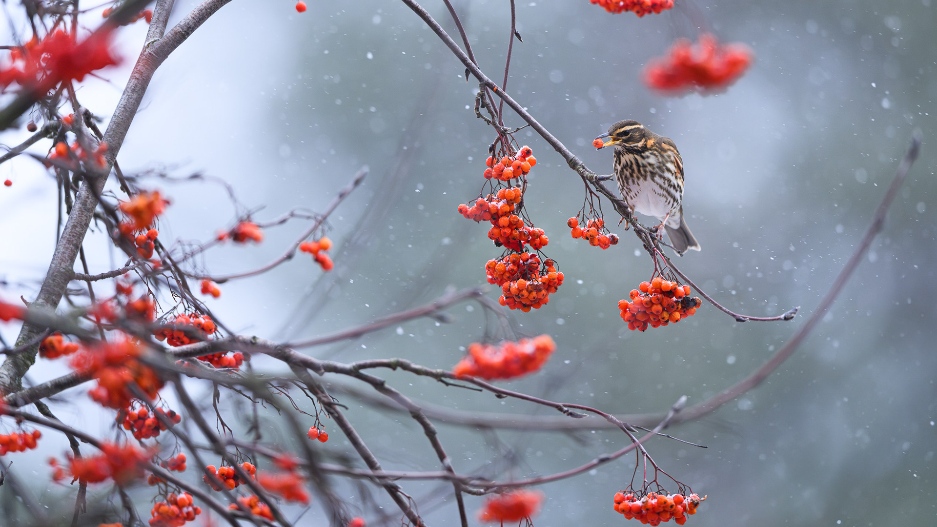 Rödvingetrast, hona/ungfågel tallbit och andra vinterbilder.
